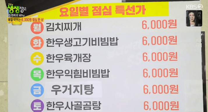 - 한우를 사용한 점심 특선 메뉴의 고정가격은 6,000원으로 직장인들에게 사랑받음.